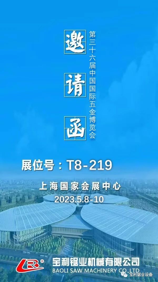 尊敬的客户,您好! 非常感谢您长期以来对宝利锯业的支持和信任。 2023年5月8日-10日,备受业界期盼与瞩目的2023第三十六届中国国际五金博览会(上海国家会展中心)拉开帷幕。经过公司多年的生产经验的沉淀,以及我们不断研发的投入,将希望通过这次机会能与贵公司共同探讨和交流,以便我们更加深入的合作。共同开拓和占领市场。