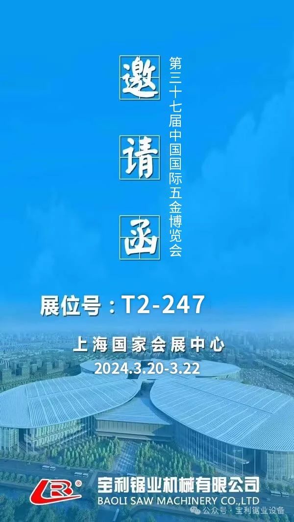尊敬的客户,您好! 非常感谢您长期以来对宝利锯业的支持和信任。 2024年3月20日—22日,备受业界期盼与瞩目的第三十四届中国国际五金博览会将在国家会展中心(上海)拉开帷幕。经过公司多年的生产经验的沉淀,以及我们不断研发的投入,将希望通过这次机会能与贵公司共同探讨和交流,以便我们更加深入的合作。共同开拓和占领市场。 地点:国家会展中心(上海) 展位号:T2-247 丹阳市宝利锯业机械有限公司 2024.03